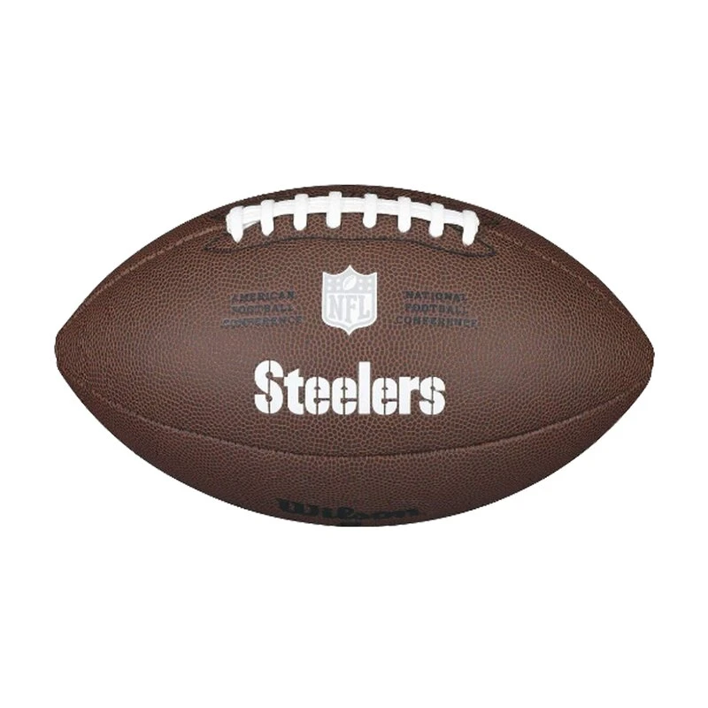 Der NFL Team Logo Football der Pittsburgh Steelers ist aus Composite Kunstleder hergestellt. Für gleichmäßigen Halt und Form, sowie längerer Haltbarkeit hat er doppelte Nähte.